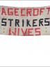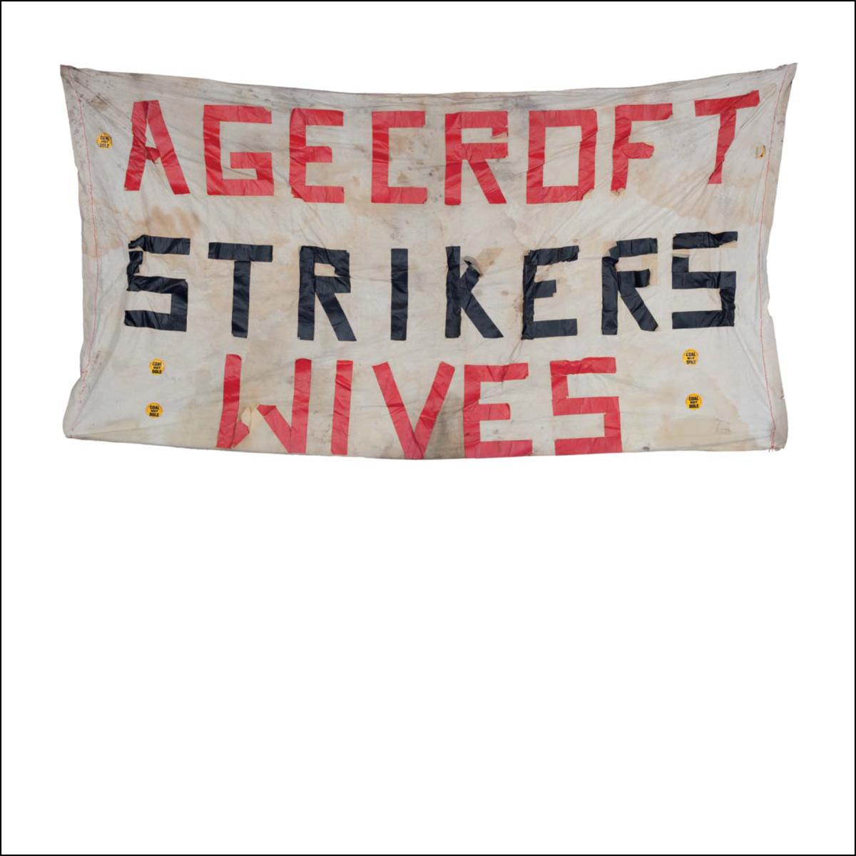 Members of the Pendlebury Branch of the NUM and craftsmen at Agecroft Colliery, Salford, Lancashire, were spilt over taking strike action at the beginning of the 1984/5 strike. A minority stayed on strike but did not have the support of the Branch. As in other areas across the country, the women rallied to aid the striking miners and played a significant role in providing material support. This is their banner. It is retained at the offices of the Lancashire Area of the NUM. Eventually the Lancashire Women Against Pit Closures was formed. Made with ‘gaffer tape’ and paint on cotton.