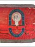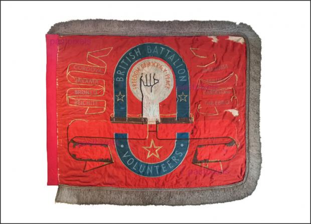 British Battalion banner, designed and created by Phyllis Ladyman, James Lucas and Kath Weaver of the anti-fascist Artists International Association in 1938; 1245mm x 1069mm; painted and embroidered on silk and cotton. A carved pole with a clenched fist at the top was made by Betty Rea, also of the AIA. An earlier banner, produced in 1937 but without the battle names, was captured in Aragón in March 1938. This replacement was hurriedly sent to Spain immediately afterwards. It is now on display at the Marx Memorial Library in London.