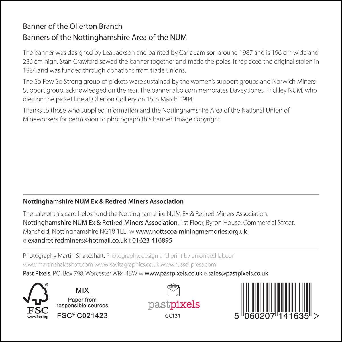 The sale of this card helps fund the Nottinghamshire NUM Ex & Retired Miners Association. 1st Floor, Byron House, Commercial Street, Mansfield, Nottinghamshire NG18 1EE www.nottscoalminingmemories.org.uk exandretiredminers@hotmail.co.uk 01623 416895