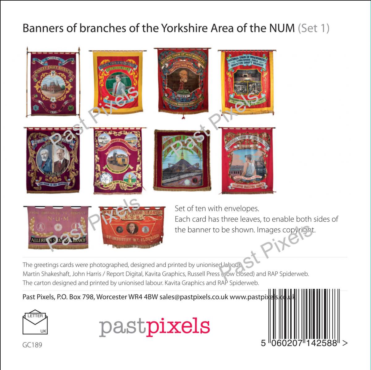 Ten greetings cards, with envelopes, using photographs of the front and the back of banners of Branches of the Yorkshire Area of the NUM in a presentation pack.