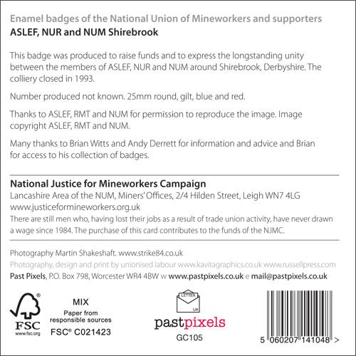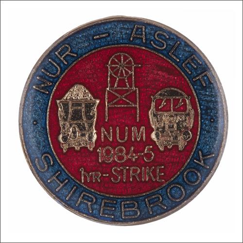 This badge was produced to raise funds and to express the longstanding unity between the members of ASLEF, NUR and NUM around Shirebrook, Derbyshire. The colliery closed in 1993. Number produced not known.