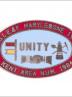 32mm x 20mm oval, gilt, red, blue and yellow.