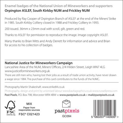 Many thanks to Brian Witts for information, advice and access to his collection. He produces the definitive book about the enamel badges and a large format poster using images of the badges to illustrate the wreckage caused by the Thatcher government to the mining industry and the mining communities. Brian ended his mining career at Littleton Colliery in the Midlands.