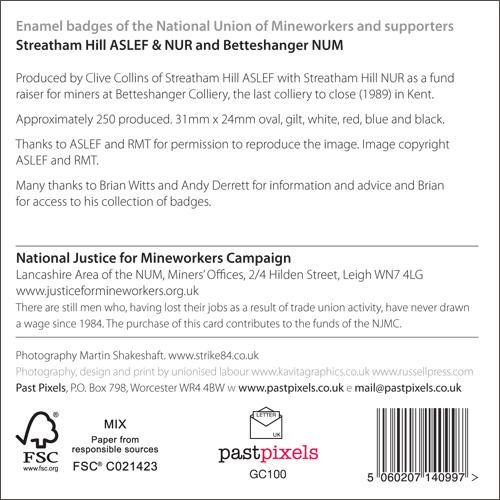 Many thanks to Brian Witts for information, advice and access to his collection. He produces the definitive book about the enamel badges and a large format poster using images of the badges to illustrate the wreckage caused by the Thatcher government to the mining industry and the mining communities. Brian ended his mining career at Littleton Colliery in the Midlands.