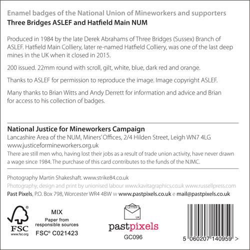 Many thanks to Brian Witts for information, advice and access to his collection. He produces the definitive book about the enamel badges and a large format poster using images of the badges to illustrate the wreckage caused by the Thatcher government to the mining industry and the mining communities. Brian ended his mining career at Littleton Colliery in the Midlands.