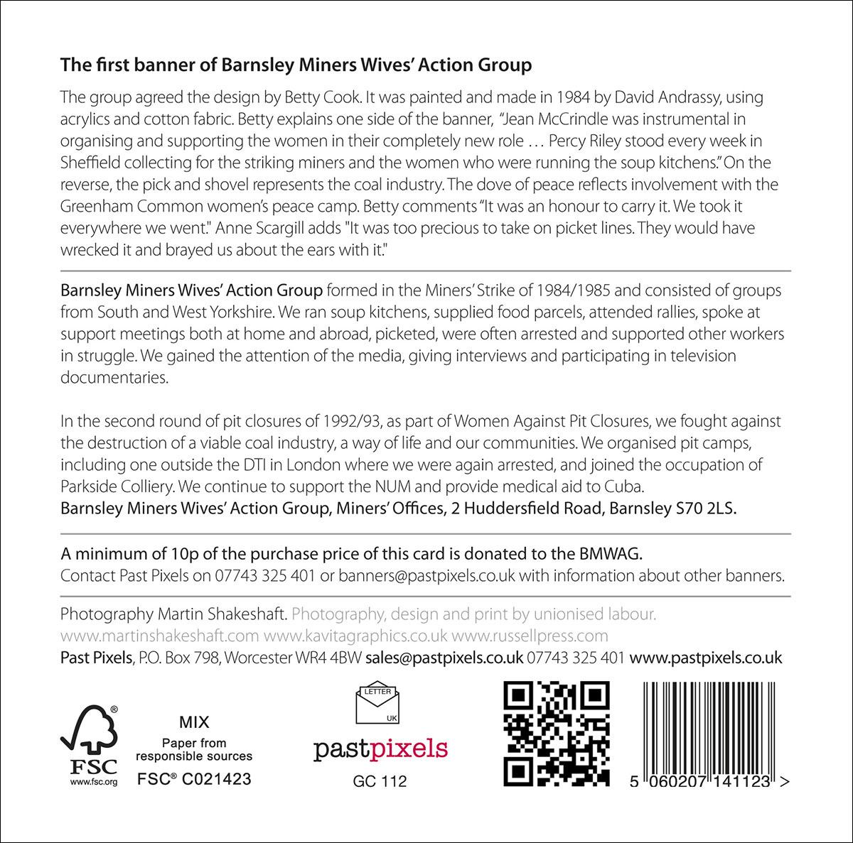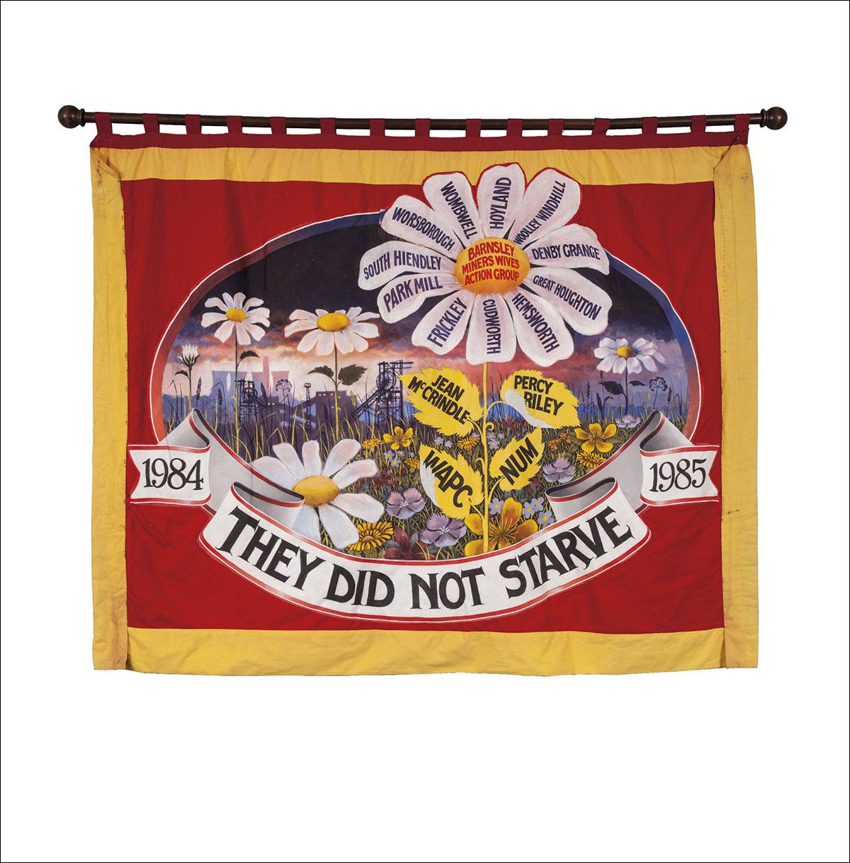 On the front of the banner, the pick and shovel represents the coal industry. The dove of peace reflects involvement with the Greenham Common women’s peace camp.