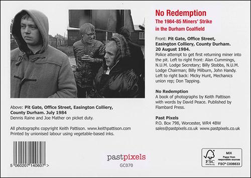 Greetings card: Pit gate, Easington Colliery Greetings card: Pit gate, Easington Colliery allDescriptionPit gate, Easington Colliery No Redemption One of a set of eight greetings cards using photographs from: No Redemption: The 184/5 Miners' Strike in the Durham Coalfield Pictures by Keith Pattison and words by David Peace http://www.keithpattison.com/noredemption We would appreciate any further information about these images. Details SKU: GC070 Product size: 120mm x 170mmProduct packaging: Supplied with an envelope in a "peel n seal" bag. Shipping Shipping category: Greetings cards The UK shipping charge for any size and any quantity is £0.60 Comments £1.50 Enter Quantity Product category: Greetings cards | Keith Pattison’s No Redemption | Product theme: Industrial disputes and strikes | Miners’ Strike 84-85 | No Redemption (photographs by Keith Pattison) | Facebook LikeGoogle Plus OneTweet Widget
