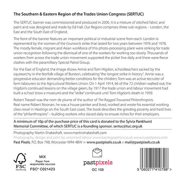 A minimum of 10p of the purchase price of this card is donated to the Sylvia Pankhurst Memorial Committee, of which SERTUC is a founding sponsor.