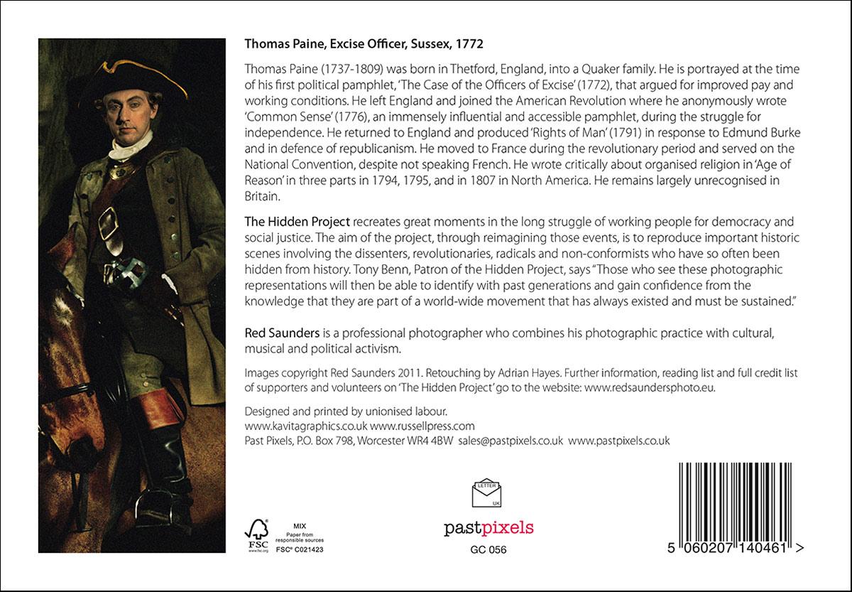 Thomas Paine (1737-1809) was born in Thetford, England, into a Quaker family. He is portrayed at the time of his first political pamphlet, ‘The Case of the Officers of Excise’ (1772), that argued for improved pay and working conditions.
