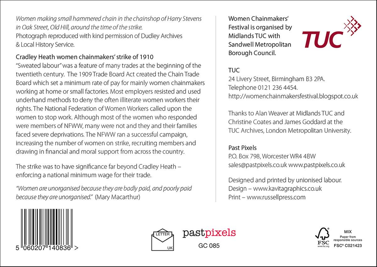 One of a set of five celebrating the successful strike in 1910 by the women chainmakers in Cradley Heath. Produced in conjunction with Midlands TUC.