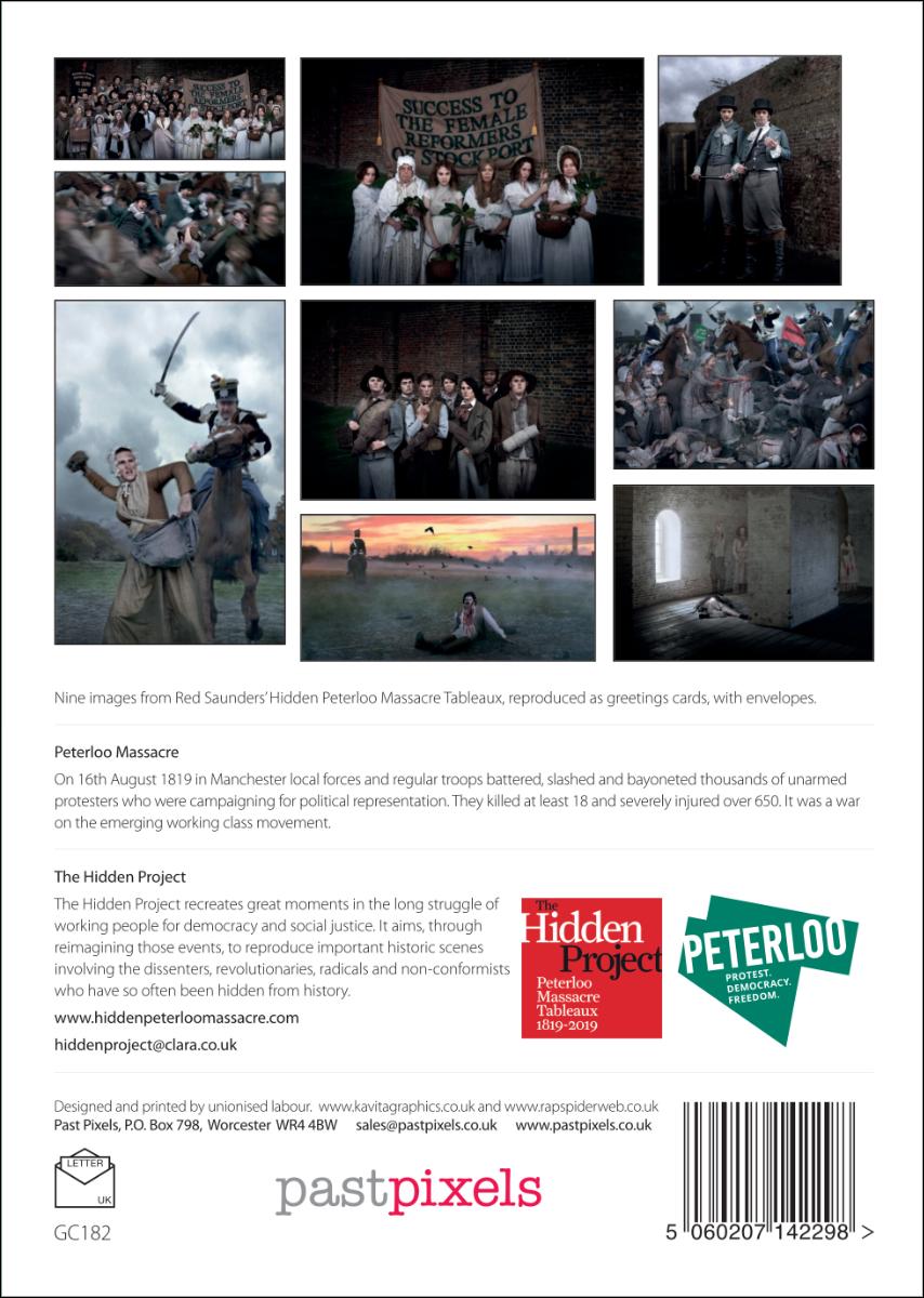 Nine greetings cards using images from Red Saunders’ Hidden Peterloo Massacre Tableaux in a cardboard carton, shrink wrapped.