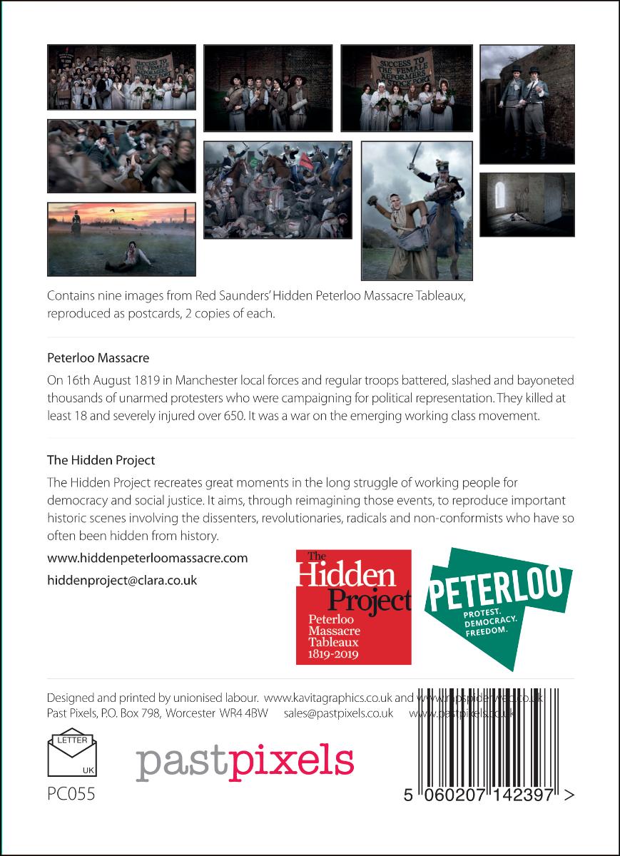 Eighteen postcards, two of each of the nine images from Red Saunders’ Hidden Peterloo Massacre Tableaux plus additional bookmarks that illustrate and describe the set.