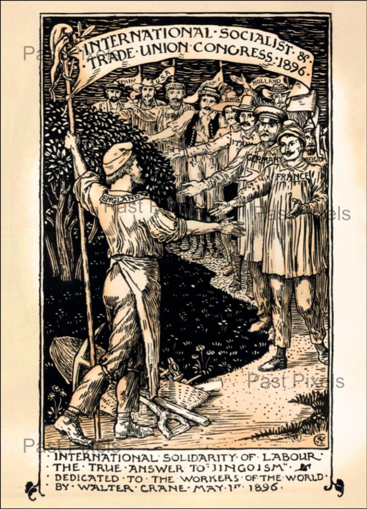 A May Day cartoon designed by Walter Crane for the International Socialist Workers & Trade Union Congress (the fourth congress of the Second International) of 1896 held in London.