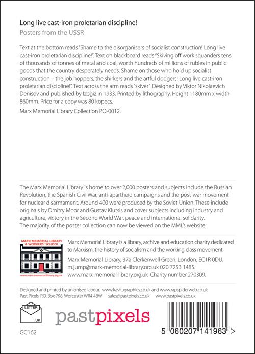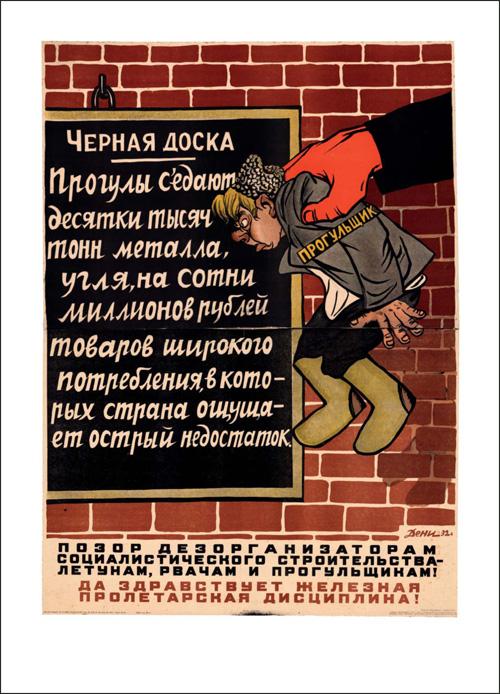 Text at the bottom reads “Shame to the disorganisers of socialist construction! Long live cast-iron proletarian discipline!”. Text on blackboard reads “Skiving off work squanders tens of thousands of tonnes of metal and coal, worth hundreds of millions of roubles in public goods that the country desperately needs. Shame on those who hold up socialist construction – the job hoppers, the shirkers and the artful dodgers! Long live cast-iron proletarian discipline!”. Text across the arm reads “skiver”. Designed by Viktor Nikolaevich Denisov and published by Izogiz in 1933. Printed by lithography. Height 1180mm x width 860mm. Price for a copy was 80 kopecs.