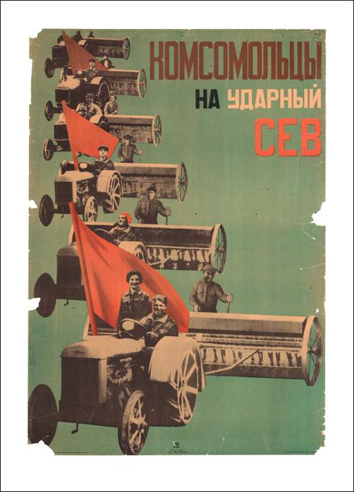 The text reads “Members of the Komsomol take part in intensive farming”. Komsomol was the political youth organisation in the USSR. Designed by Gustav Klutsis and published by Izogiz in 1931. 10,000 printed by lithography in 3 colours. Height 1010mm x width 715mm. The price for a copy was 50 kopecs.