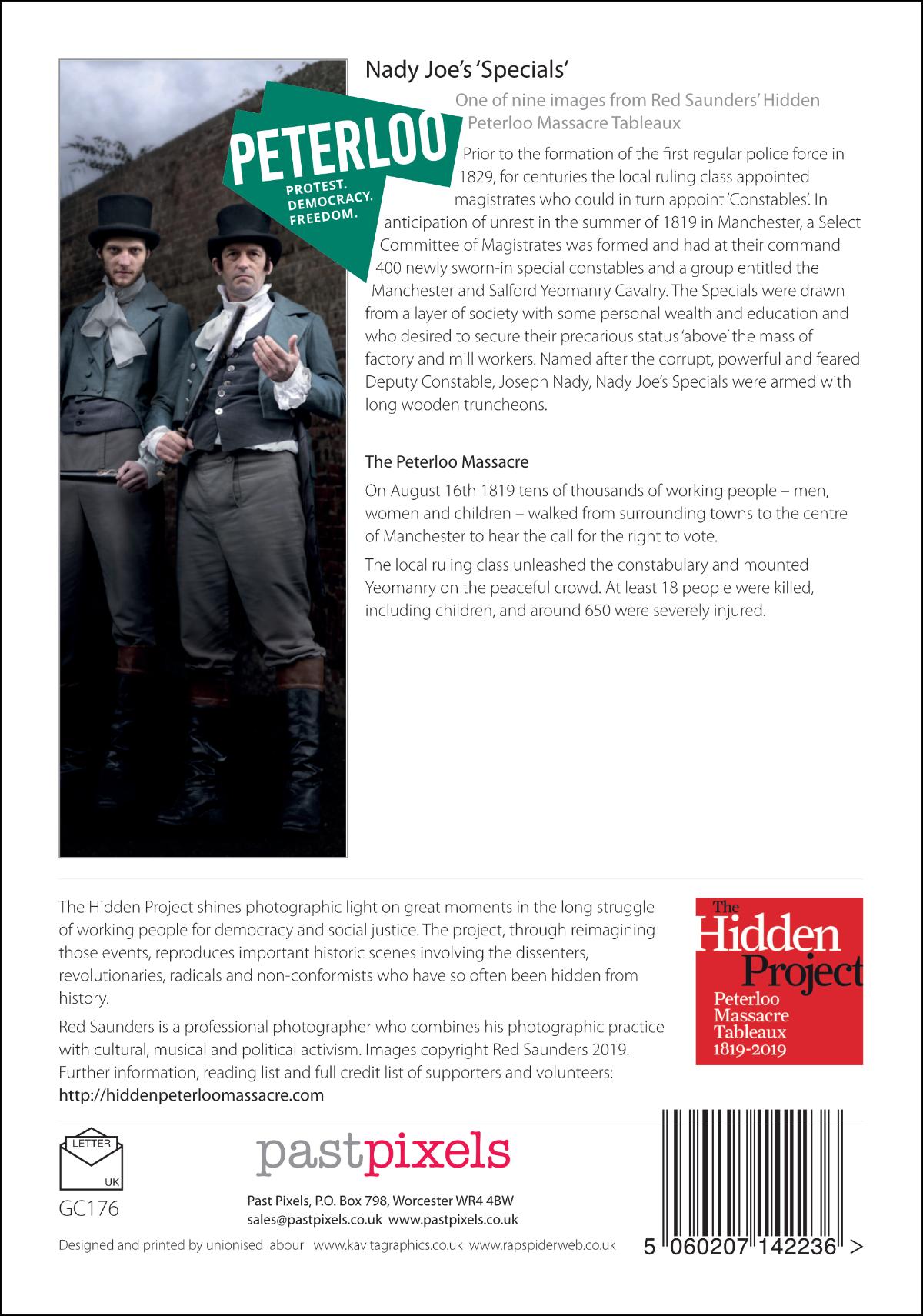 Red Saunders is a professional photographer who combines his photographic practice with cultural, musical and political activism. Images copyright Red Saunders 2019. Further information, reading list and full credit list of supporters and volunteers: www.hiddenpeterloomassacre.com . For further information hiddenproject@clara.co.uk