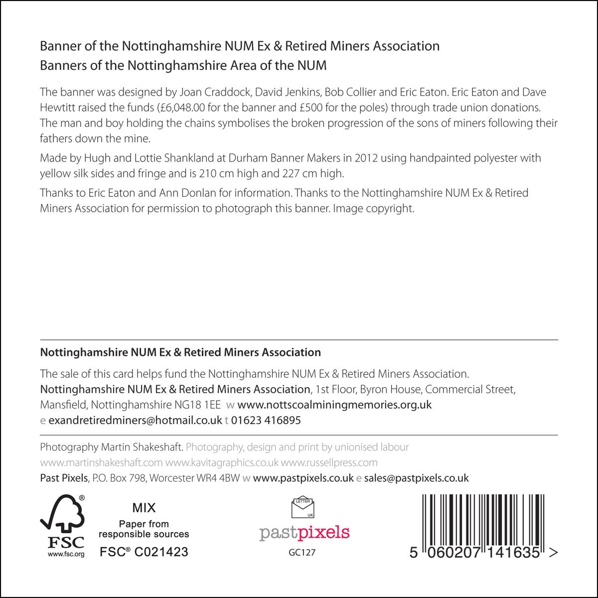The sale of this card helps fund the Nottinghamshire NUM Ex & Retired Miners Association. 1st Floor, Byron House, Commercial Street, Mansfield, Nottinghamshire NG18 1EE www.nottscoalminingmemories.org.uk exandretiredminers@hotmail .co.uk 01623 416895