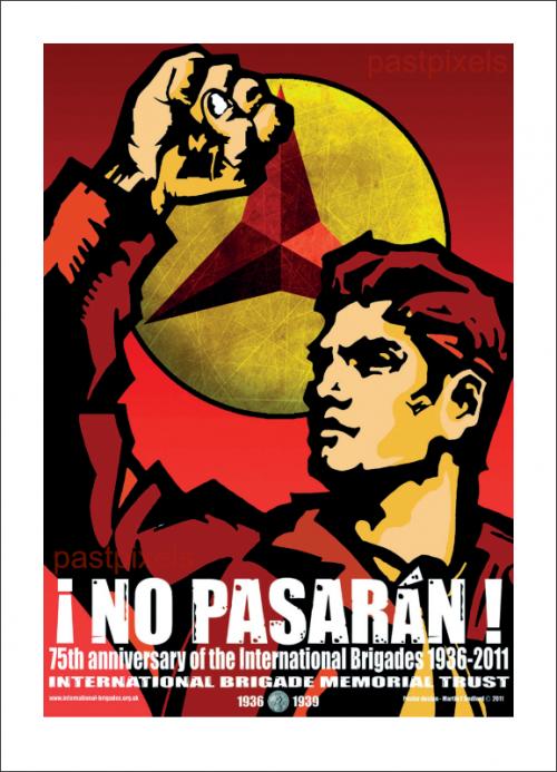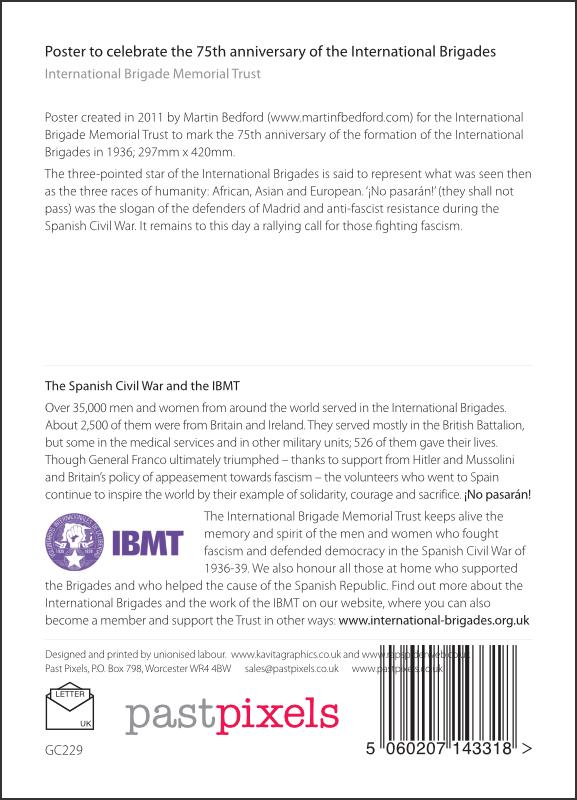Poster created in 2011 by Martin Bedford (www.martinfbedford.com) for the International Brigade Memorial Trust to mark the 75th anniversary of the formation of the International Brigades in 1936; 297mm x 420mm. The three-pointed star of the International Brigades is said to represent what was seen then as the three races of humanity: African, Asian and European. '¡No pasarán!' (they shall not pass) was the slogan of the defenders of Madrid and anti-fascist resistance during the Spanish Civil War. It remains to this day a rallying call for those fighting fascism.