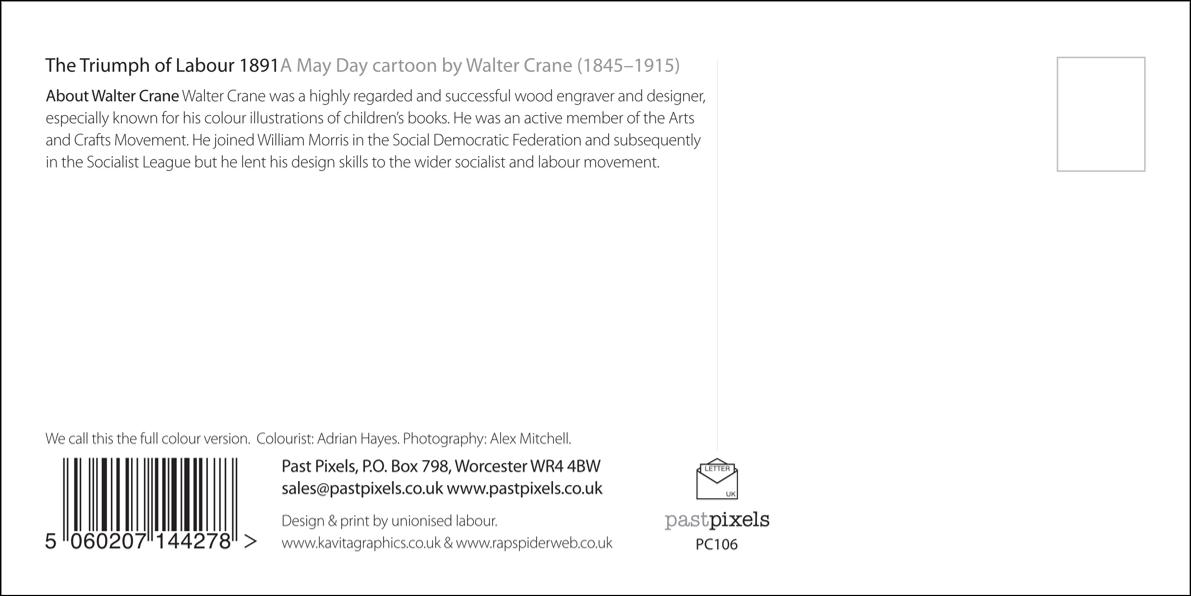 The original black and white cartoon would have made reproduction possible using the affordable printing methods available to the workers’ movement at that time. We have exploited modern digital tools to create this coloured version. We call this the full colour version.